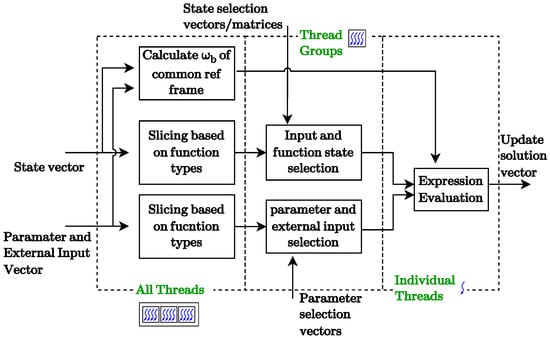 The software implementation of the GPU consists of execution units defined as threads, blocks, and grids, with the threads being the smallest execution unit. The number of threads per block and the number of blocks per grid can be defined so as to optimize the performance gain. This requires similar functions to be combined into thread groups that can fit into individual blocks. As a result, each group of functions (lines, buses, sources, etc.) is assigned to a group of threads identified by unique thread identifiers, and each function is assigned to a particular thread. Depending on the type of function, it may contain computation of a number of DAEs. The dynamic phasor model discussed in Section 1 consists of three main types of DAEs. These include: