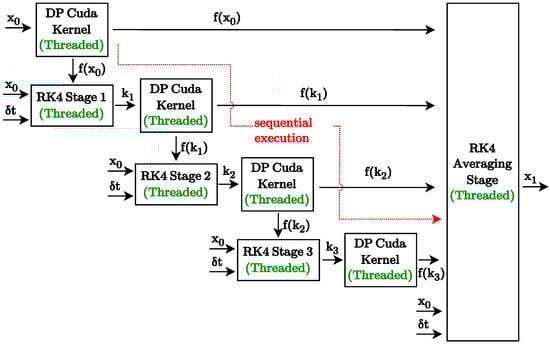 The four stages of the RK4 solver require evaluation of the dynamic phasor equations sequentially. While the four stages are executed one after the other, the evaluation of each stage can be parallelized using threads. Each stage of the RK4 is thus sequentially executed as an individual CUDA kernel while providing its output to the dynamic phasor model. The execution of the RK4 solver in the GPU is shown in Figure 4.