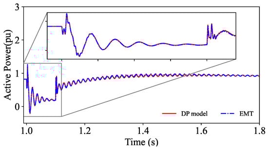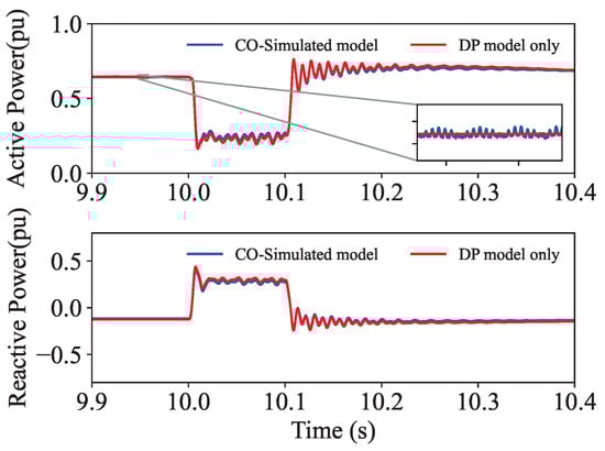 The d and q components of the bus voltage’s dynamic phasor (), and the frequency of the common reference frame , in the dynamic phasor model are transferred to the EMT model through the EMT co-simulation API and transformed from the common reference frame to the converter reference frame. They are then converted to three-phase quantities and provided as PCC voltages to the converter model in the EMT simulator. The converter’s current injections to the PCC, which are in the abc domain, are then converted to dq0 components and transformed to the common reference frame before being provided as current injections to the same bus in the system’s dynamic phasor model. Both models were simulated with a time-step of 30 s. A fault was applied at bus 2, and the active and reactive power responses of the grid-forming converter with and without co-simulation are shown in Figure 13. The case without co-simulation was simulated using dynamic phasors and solved using the RK4 integration method. For the co-simulated case, the dynamic phasor components of the network were solved using the RK4 integration method, and converter models were solved using the EMT solver. The responses indicate a close agreement between the two models.