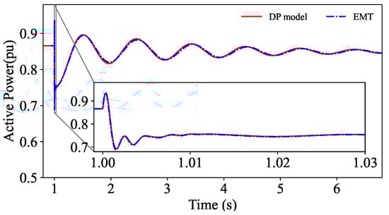Additionally, a tripping event was simulated for the line between buses 8 and 9 by forcing the solution of the line function to zero and removing the respective capacitances from the terminating bus functions. As a result, the current injections (from the removed line) to the connecting buses were driven to zero. The resulting transient response of the active power of the generator connected to bus 9 is shown in Figure 6 and is in close agreement with EMT results.