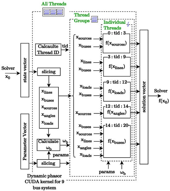 Unlike CPUs, modern GPUs consist of thousands of computational cores that allow parallel execution on a massive scale. Popular hardware implementations include NVIDIA’s Compute Unified Device Architecture (CUDA) and AMD’s ROCm. The GPU implementation for the model in this paper utilizes CUDA. The functions executed in the GPU are known as CUDA kernels. The dynamic phasor model is implemented as a single CUDA kernel, where individual functions and function groups within the kernel are executed in parallel for each evaluation.