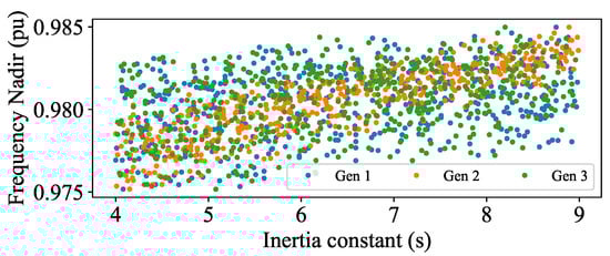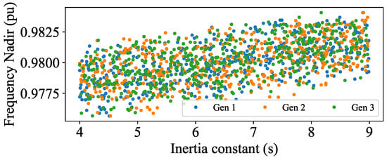 The system was initialized with all three synchronous generators rated at 150 MW. The frequency nadir of each case was plotted versus the value of the inertia constant of each generator, as shown in Figure 8. While the general impact of increasing the inertia constant was improvement of the frequency nadir, the contribution of each generator’s inertia constant was similar for all the generators.