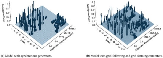 In Figure 10a, the states 1–49 belong to the synchronous generators; the rest of the states belong to the network and inductive loads. The plot indicates a clear separation in the participation factors. Participation in lower frequencies is dominated by synchronous machines, while the network states participate in higher-order dynamics associated with -sections.