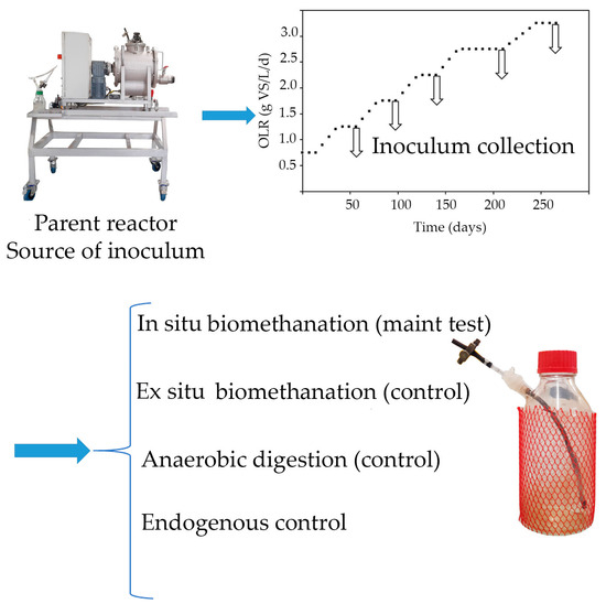 The aim of this study is to enhance our understanding of biomethanation processes and their responses to changing OLRs. The OLR is a crucial parameter in anaerobic digestion processes, as it determines the flow of organic matter to be degraded and ultimately converted into biogas. In order to understand and optimize in situ biomethanation, the influence of this operational parameter on performance needs to be elucidated. In this study, a wide range of OLRs ranging from 1.25 to 3.25 g VS/L/d was investigated. One of the main novelties is the use of an inoculum adapted to the organic load, achieved through the implementation of a reactor dedicated to inoculum production. Biomethanation performance was monitored based on kinetic data (i.e., hydrogen consumption rates) and metabolite production, and the use of multiple types of control reactors, including ex situ, AD, and endogenous reactors, allowed for a comprehensive examination of biomethanation processes under different operational conditions. Furthermore, the response to starvation conditions of microbial communities adapted to different OLRs was assessed.