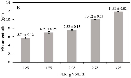 Figure 4B shows a consistent upward trend in the VS concentrations with increasing OLRs. With a constant HRT in the present experiments, the increase in OLR leads to higher substrate VS concentrations entering the digester. As the methane yields were constant, it can be hypothesized that the substrate was equally converted into biomass at any OLR value, implying that higher VS concentrations represent an increase in active biomass concentrations [39]. Given that FW is a highly biodegradable substrate (VS/TS of 94.2%, with TS being total solids), the increase of non-biodegradable organic matter was negligible. To validate this hypothesis, quantitative polymerase chain reaction (qPCR) was performed. However, the differences in biomass concentrations (log-based) at increasing OLRs were too small to allow us to observe significant differences (Figure S1).