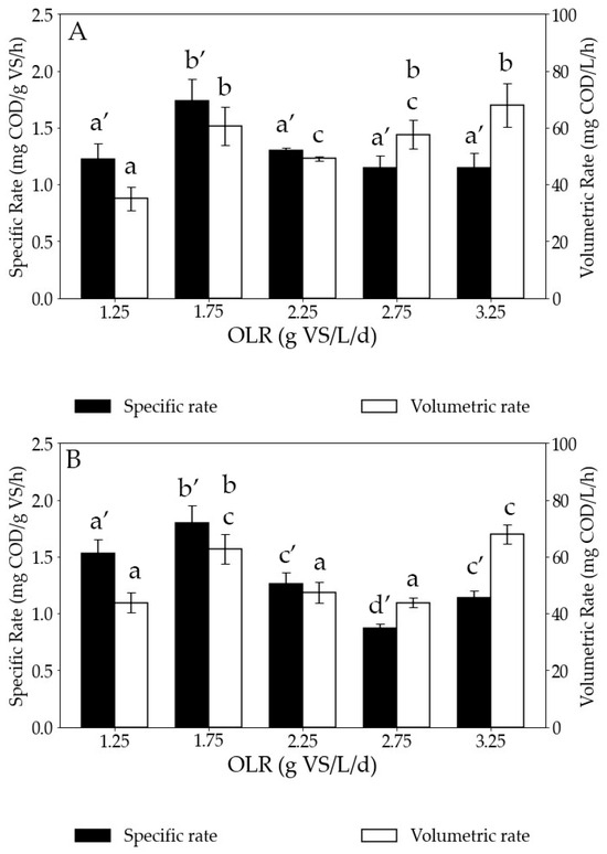 Specific and volumetric hydrogen consumption rates for (A) in situ and (B) ex situ biomethanation tests at increasing OLRs. COD stands for chemical oxygen demand, VS for volatile solids, and OLR for organic loading rate. Bars sharing the same letter at the top are not statistically different in terms of hydrogen consumption rate.
