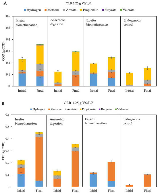 Cumulative COD mass balances for the test at (A) 1.25 g VS/L/d and (B) 3.25 g VS/L/d. Data for hydrogen, methane, and VFAs at the beginning (initial) and at the end (final) of the batch tests are provided. Results are shown for in situ biomethanation, AD, ex situ biomethanation, and endogenous tests. OLR stands for organic loading rate, COD for chemical oxygen demand, AD for anaerobic digestion, and VFA for volatile fatty acid.