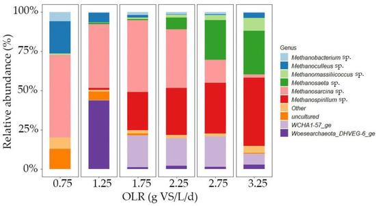 Relative abundance of archaea at genus level; higher OLR leads to a higher abundance of Methanospirillum, which is a hydrogenotrophic methanogen.