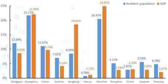 The Guangdong–Hong Kong–Macao Greater Bay Area is an urban agglomeration consisting of the two special administrative regions of Hong Kong and Macao and nine cities in Guangdong Province, including Guangzhou, Shenzhen, Zhuhai, Foshan, Zhongshan, Dongguan, Zhaoqing, Jiangmen, and Huizhou (Figure 1). It is a key spatial unit in China’s efforts to create a world-class urban agglomeration and participate in global competition. It is comparable to the four major bay areas in the world, including the New York Bay Area and the San Francisco Bay Area in the United States and the Tokyo Bay Area in Japan. The total area of this region is 56,000 square kilometers, with a population of over 86 million in 2022. The total GDP exceeds CNY 13 trillion, making it one of the most open and economically dynamic regions in China. In the Guangdong–Hong Kong–Macao Greater Bay Area, Shenzhen, Guangzhou, and Hong Kong are the main core regions, accounting for 65.55% of the total regional GDP and 50.67% of the region’s total population (Figure 2). Over the past two decades, the GDP of the Greater Bay Area has experienced significant growth, rising from CNY 2.34 trillion in 2000 to CNY 13.04 trillion in 2022. This significant economic expansion has led to a substantial increase in energy consumption. As the rapid economic development in the Greater Bay Area continues, total energy consumption is expected to continue to rise. Currently, the structure of energy consumption in the Greater Bay Area is dominated by traditional energy sources such as coal and oil. However, as renewable energy technologies continue to advance, the region is gradually achieving a more diversified energy consumption structure, with the share of renewables in total energy consumption steadily increasing.