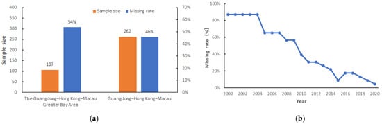 The lack of energy consumption data. (a) Sample size and missing rate of energy consumption data for the Guangdong–Hong Kong–Macau Greater Bay Area and Guangdong–Hong Kong–Macau from 2000 to 2020. (b) Missing rate of energy consumption data for Guangdong–Hong Kong–Macau from 2000 to 2020.