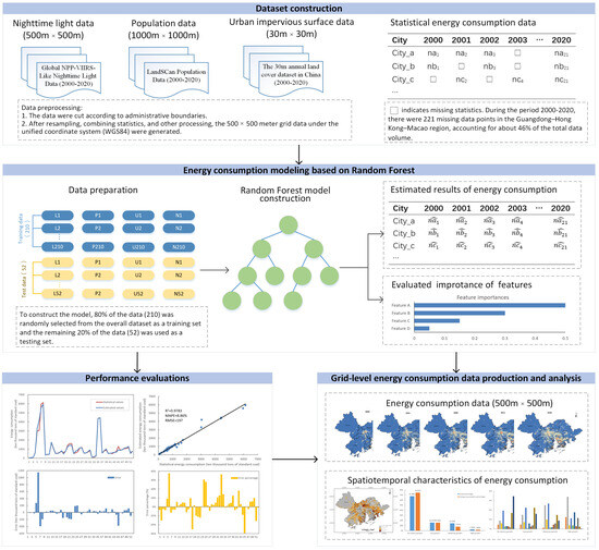 The entire workflow of this study is illustrated in Figure 4. First, nighttime light data, population data, urban impervious surface data, and energy consumption data for the years 2000–2020 were organized based on the administrative boundaries of the Guangdong–Hong Kong–Macao region. The nighttime light data, population data, and urban impervious surface data were obtained from administrative district statistics from spatial grid data, while the energy consumption data were obtained from city-level statistical data. The total number of organized data samples was 262. Since the areas of administrative units vary greatly within Guangdong–Hong Kong–Macao, resulting in large differences in data size, the data were standardized by dividing each dataset by the corresponding administrative area. This transformation was performed to express the data as density as follows: nighttime light density data (brightness values per square kilometer), population density data (population per square kilometer), urban impervious surface density data (urban area per square kilometer), and energy consumption density data (ten thousand tons of standard coal per square kilometer). Then, using the random forest algorithm with the nighttime light, population data, and urban impervious surface density data as feature values, an energy consumption estimation model was built for the city-level data in the Guangdong–Hong Kong–Macao region. This model provided energy consumption values for the years 2000–2020. The accuracy of the model was evaluated by calculating the coefficient of determination (R2), mean absolute percentage error (MAPE), and root mean square error (RMSE) for each dataset. Subsequently, the importance of different feature variables determined by the random forest algorithm was used to perform a top-down weighting to calculate the energy consumption values on a 500 m grid. Finally, the spatiotemporal characteristics of energy consumption were analyzed at both the city and grid levels.