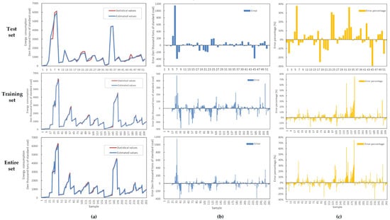 A comparison of the results between the estimated and statistical values of the test set, training set, and entire set. (a) The comparison graph of statistical and estimated values. (b) The error of statistical and estimated values, error= estimated values- statistical values. (c) The error percentage of statistical and estimated values, error percentage = (estimated values − statistical values)/statistical values.