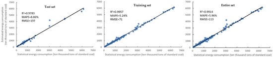 Using Equations (1)–(3), R2, MAPE, and RMSE were calculated for each dataset. The results are shown in Figure 6. The R2 values for the test set, the training set, and the entire set were 0.9783, 0.9957, and 0.9914, respectively. The values were all very close to 1, indicating a well-fitted model. The MAPE values for the test set, the training set, and the entire set were 8.86%, 5.24%, and 5.96%, respectively (all below 10%). According to the evaluation criteria established by C.D. Lewis, these results suggest a high model accuracy, which further confirms the effectiveness of the model.