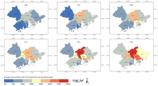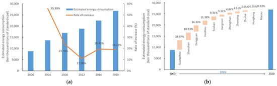- Energy consumption in the study area increased significantly from 2000 to 2020 with a growth rate of about 205%. Guangzhou, Shenzhen, Dongguan, and Huizhou accounted for 72% of the total increase, indicating that these areas had rapid development and high energy consumption.