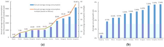 The annual average energy consumption and energy consumption growth rate of cities in the Greater Bay Area. (a) The annual average energy consumption. (b) The annual average energy consumption growth rate.