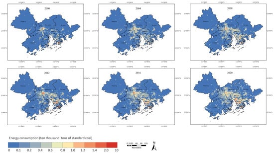 Maps of energy consumption at the city scale for six selected years over the study period from 2000 to 2020.