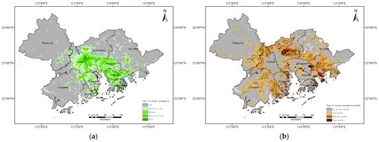Using the natural breakpoint method, which can maximize the differences between classes with no effect of human factors [45,46], the average energy consumption of the grid in the Greater Bay Area was divided into five levels (Figure 11a), namely, low energy consumption areas, relatively low energy consumption areas, medium energy consumption areas, relatively high energy consumption areas, and high energy consumption areas. The average annual growth rate of energy consumption in the Greater Bay Area grid was divided into four levels (Figure 11b), namely, a no significant growth area, a low growth area, a moderate growth area, and a high growth area. It can be observed that there is a certain negative correlation between energy consumption and energy growth at the grid level, indicating that high energy consumption areas tend to have lower growth rates.
