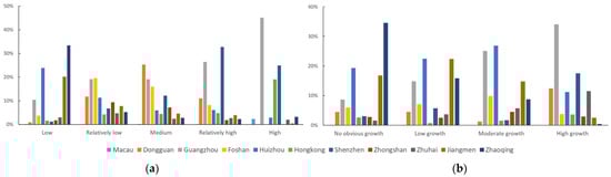 The area proportions of energy consumption levels in each city within the Guangdong–Hong Kong–Macao Greater Bay Area are summarized (Figure 13a), along with the area proportions of energy consumption growth levels in these cities (Figure 13b). The high energy consumption areas are concentrated in Guangzhou, Shenzhen, and Hong Kong, while the low energy consumption areas are concentrated in Zhaoqing, Huizhou, and Jiangmen. The high energy consumption growth areas are concentrated in Guangzhou, Shenzhen, Dongguan, Zhuhai, and Huizhou, while the low energy consumption growth areas are concentrated in Zhaoqing, Huizhou, and Jiangmen. Observing the internal changes within the cities reveals significant variations in energy consumption levels. Shenzhen, for example, has a relatively even distribution across consumption levels, with high energy consumption areas accounting for only a small proportion (3.59%), while the remaining high energy consumption areas account for between 22% and 27%. In contrast, Zhaoqing has a more clustered distribution, with approximately 97% of the area classified as a low energy consumption area. To a certain extent, this reflects the balance of development within cities. However, fine-grained energy consumption data are required to analyze intra-city differences, which emphasizes the importance of compiling energy consumption data with high spatial resolution.