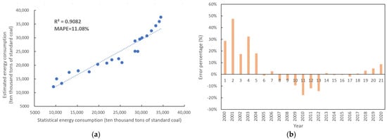 Accuracy assessment of the energy consumption in Guangdong Province. (a) The scatter diagram of statistical and estimated energy consumption of Guangdong Province. (b) The error percentage of statistical and estimated energy consumption of Guangdong Province.