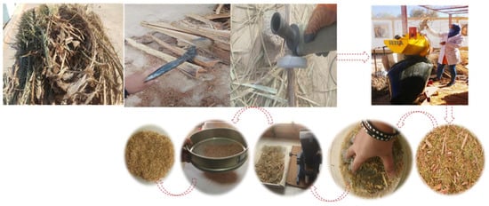 The samples of lignocellulosic waste from the date palm (Phoenix dactylifera L.) variety Takarbouche were taken in October, for 2 consecutive years (2017–2018), during the palm tree cleaning operations of the National Research Institute in Agronomy of Algeria in Adrar (27°52′00″ N, 0°17′00″ W at 264 m altitude). Four types of date palm waste—namely palm leaves (briefly referred to as “palms” in the followings), petioles, bunch, and bunch peduncles—were collected. All samples were first dried in open air and then coarsely grounded. Washing was also necessary to remove all impurities and contaminants, such as sand particles, bugs, and animal excrement, that might alter the characterization of the substrate. The washed waste was dried and crushed a second time using a micro-crusher to achieve a particle size ≤2 mm (Figure 1). Sawdust collected from a local furniture manufacturer was used as a reference substrate. Similarly to date palm waste, sawdust samples for analytic characterization were first pre-treated (washed to remove impurities, dried in the open air and ground to a granulometry ≤2 mm) and characterized. Sawdust destined for the gasification test was used in raw condition. The sample preparation is done according to ISO14780 [].