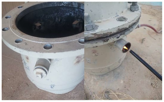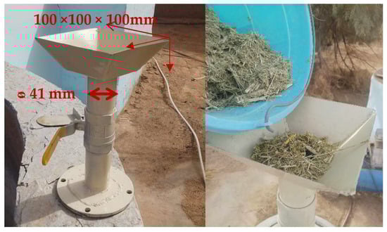 - Feedstock inlet: The substrate supply is maintained in the upper part of the gasifier body, with the addition of a feeder made of a 41 mm diameter pipe controlled by a valve and a 10 × 10 × 10 cm tank. The feeder facilitates the substrate supply and limits substrate losses (Figure 2).