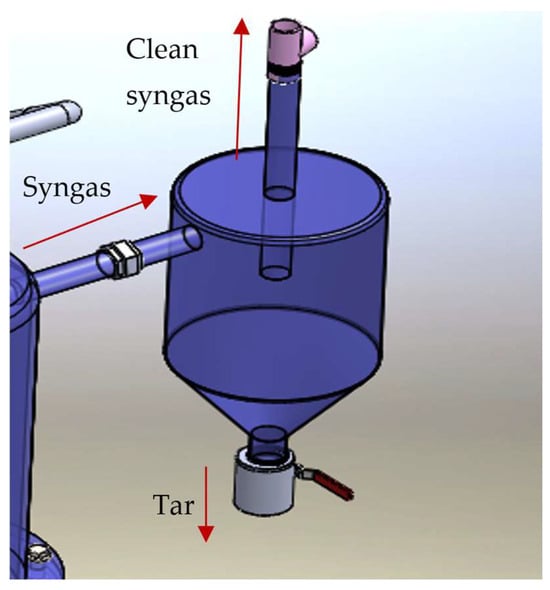 - Syngas outlet and gas cleaning system: The syngas outlet is moved from the top to the upper side of the gasification body with an increase in the outlet diameter from 21 mm to 40 mm to avoid risks linked to the pressure increase. To clean the synthesis gas, a cyclone-type cleaning system is connected to the gasification body to remove undesired compounds (mainly tars). The syngas outlet and the cleaning cyclone are shown in Figure 3.