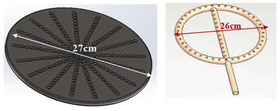 - Gasifying agent inlets: In the preliminary design, the gasification agent distribution system consisted of a 29 cm long single copper tube. This is replaced by two half circles of 26 cm diameter connected with a straight pipe all in copper equipped with 3 mm diameter holes over their entire surface, as shown in Figure 4 (right), to provide better air distribution during the gasification process.