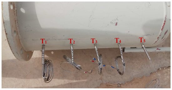 Sawdust is used to test the correct functioning of the gasification prototype after modification in the same way as the date palm waste. To facilitate the ignition of the substrate inside the gasifier, 100% renewable bioethanol (without any petroleum derivatives or chemical additives) is used as the combustible agent. Air is used as the gasifying agent and is supplied by a medium-sized air compressor, where the air flow can be controlled using an integrated valve. Two gasification tests are carried out separately for each type of date palm waste (palms, petioles, bunch, and bunch peduncles), feeding 1 kg of waste to the gasifier. Temperature monitoring is carried out, every 5 s, using high-temperature (+700 °C) K-type probe thermocouples through 5 points starting 10 cm above the substrate bed (T1) and distributed along the gasifier height at 10 cm intervals. The thermocouples are connected to a Fluck Hydra Series II data acquisition system (Figure 7).