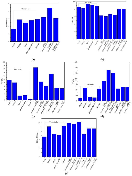 The VM concentration affects the combustion properties and facilitates ignition. In general, a low volatile matter concentration indicates low reactivity, which creates challenges during gasification, resulting in inefficient conversion and high coal output [,]. In addition, the biomass is compared to similar and other types of date palm residues, as comprehensively shown in Figure 8. Figure 8a reports the analysis of the final moisture of the sample analyzed, which is on average drier compared to the other samples to whom the literature refers to. However, a good agreement is found with palms from []. Considering the samples on a dry basis, Figure 8b shows that the obtained VM values in this study for date palm waste are higher than those of our reference substrate and those obtained in previous studies [,,,], ranging from 82.47% to 94.05%. This high percentage of VM is favorable for thermal conversion, as mentioned above [].