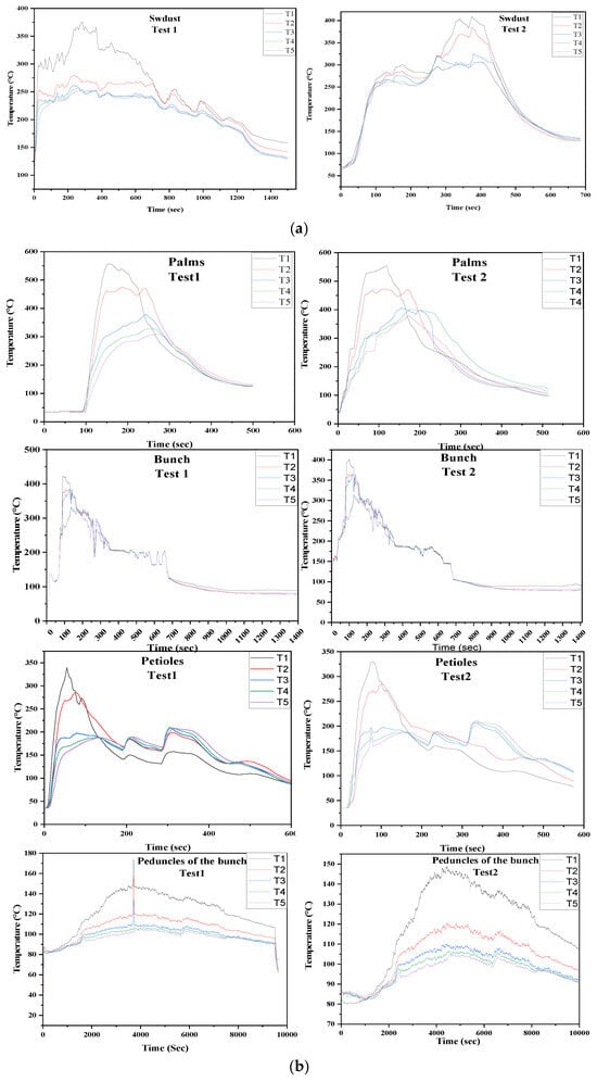 Temperature profiles for the gasification tests: (a) sawdust; (b) date palm waste.