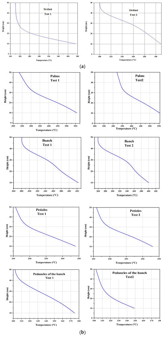 Axial temperature profile: (a) sawdust; (b) date palm waste.