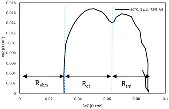 The EIS technique was applied to determine the effect of resistances to cell performance and to analyze the individual contributions of each operating parameter that caused performance loss. The EIS data characterize the components of the total impedance with respect to high- and low-frequency values to further determine the internal resistances associated with the fuel cell. These resistances can be characterized by higher- and lower-frequency loops represented by the Nyquist plot, which is the method most widely used to analyze impedance data representing the negative of imaginary and real parts of the fuel cell [56,57]. Under various testing and operational conditions, the Nyquist plots may comprise low-, medium-, and high-frequency loops [58,59]. There are usually two loops representing different frequencies: the high frequency loop characterizes the charge-transfer processes related to ORR represented by Rct and the low-frequency loop indicates diffusion/mass transport limitations due to flooding denoted as Rtm [60]. The total cell resistance can be described in three types of resistances: mass transport resistance (Rtm), charge-transfer resistance (Rct) and ohmic resistance (Rohm). Ohmic resistance of the cell is associated with the high frequency region of Nyquist plot. Figure 2 illustrates the Nyquist graph under the fuel cell operating conditions for 80 °C, 75% RH, and back pressure of 5 psig conditions.