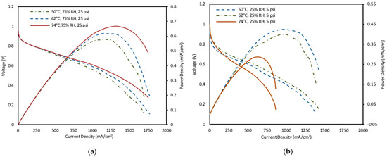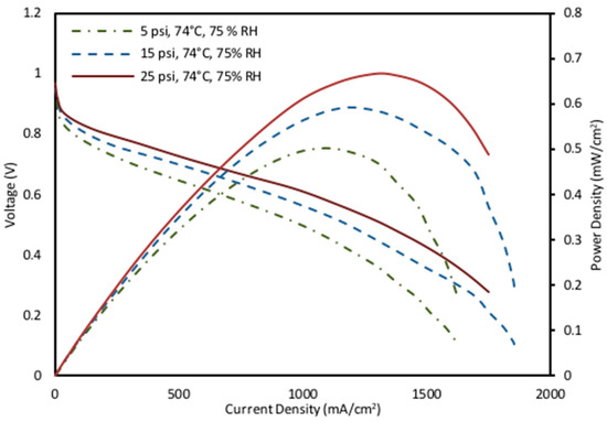 The effect of pressure across various humidity and temperature conditions was also studied for fuel cell operation. The activation overpotential is affected by the proton conductivity because of a change in the back pressure applied to the cell. A rise in membrane resistance is caused by decreasing the partial pressures and membrane dehydration [74]. Furthermore, increasing back pressure was observed to increase the fuel cell performance (Figure 7). The highest power density value was recorded as 0.647 mW/cm2 at 25 psig, 74 °C, and 75% RH. The medium operating parameters of 62 °C and 55% RH and low operating parameters of 50 °C and 25% RH followed the same pattern as the high fixed operating parameters shown in Figure 7.