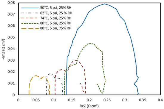 As discussed above, the EIS analysis was conducted to further support the polarization curve results and performance analysis. The ohmic resistance of the fuel cell can be identified by the point at which the high-frequency portion of Nyquist plot intersects the horizontal axis, which can be seen in Figure 4. The values of Rohm for each temperature and humidity conditions can be seen in Table 3, and the result supports the data from previous studies with Nafion® 212 [65]. The changes observed in the diameter of the higher-frequency loop were due to a compound effect of both conductivity and mass-transport limitations that occurred in the catalyst layer. Since the membrane resistance is the main cause for ohmic resistance in the cell [66], the impedance data suggest that the loss of performance under dry conditions is due to increased cell resistance. This was demonstrated by the increase in membrane resistance when the temperature decreases at the same humidity level (Figure 4). The ohmic resistance at 80 °C was measured at approximately 0.14956 Ω cm2 for 25% RH, whereas it was 0.033104 Ω cm2 for 75% RH. The ohmic resistance was observed to considerably increase as the humidity decreased, resulting in high mass transfer losses.