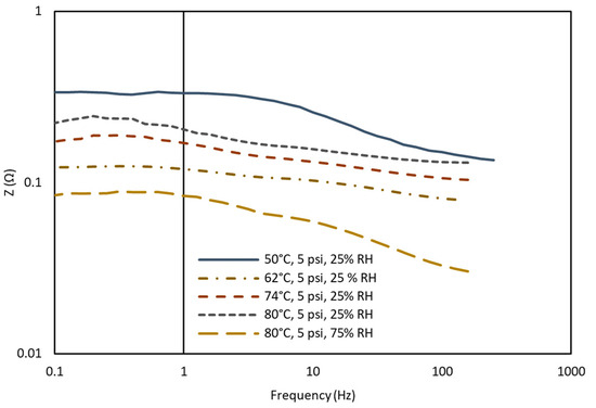 As the temperature and humidity operating conditions increase, the membrane will experience increased hydration, leading to reduced ohmic resistance. Therefore, the drying effect is seen at high-temperature and low-humidity conditions (80 °C and 25% RH), as indicated in Figure 4, where the high-frequency resistance peak of impedance was increased by the low humidity levels [63,64]. As the temperature changed from 50 °C to 80 °C, the water content in the membrane evaporated, leading to membrane dehydration. This resulted in decreased membrane conductivity and increased membrane resistance.