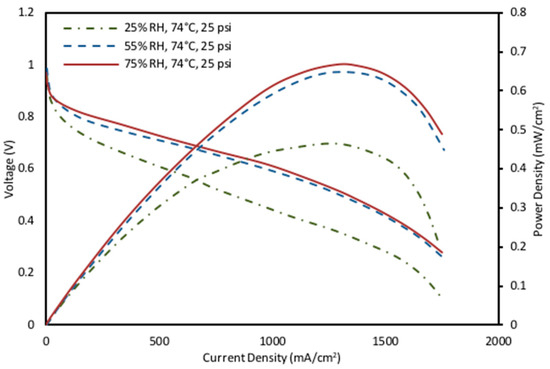 Effect of relative humidity on power density and polarization curves characteristics of high fixed operating parameters of 74 °C and 25 psig.