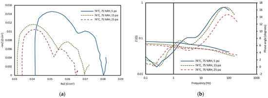 The fuel cell performance is observed to increase with higher pressure due to faster electrode kinetics of lower charge-transfer resistance. The impedance measurements were conducted at three different pressure values (5, 15, 25 psig) at a fixed temperature of 74 °C. The impedance measurements confirmed that when the back pressure was increased, the ohmic resistance of the cell decreased and the mass transport losses reduced (Figure 8). This was due to higher mass transport through the membrane at higher pressures. Figure 8a demonstrates the variation in the magnitude of the cell resistance for the frequency range, along with the phase angle. The data at the lowest pressure clearly show the highest impedance magnitude and phase angle. This discovery suggests that the combination of high pressure, elevated relative humidity, and increased temperature resulted in the highest performance and power density values, while maintaining ohmic resistances within an optimal range during the optimization experiments.