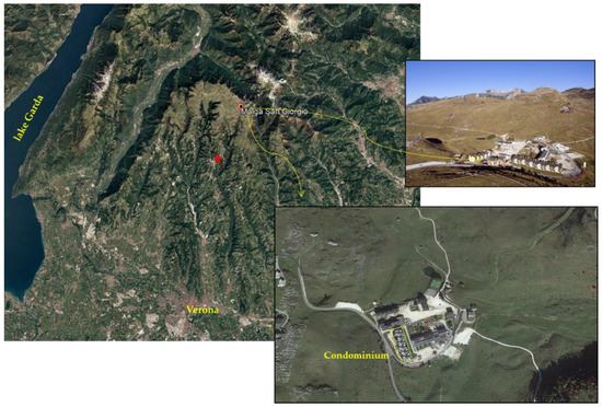 From a geographical point of view, the residential building complex that includes the Condominium discussed in the present paper, is located at a locality called ‘Malga di San Giorgio’ in the central area of the Lessinia plateau, northern Italy, at an altitude of about 1490 m. In particular, the case study is represented by the southwestern building shown in the inset of Figure 1 (Condominium; yellow rectangle).