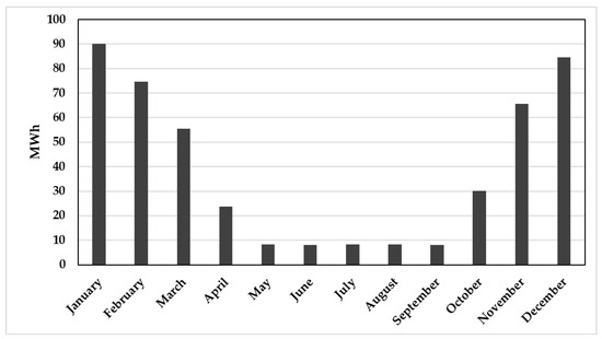 From an energy point of view, the monthly load distribution (heating and domestic hot water) is represented in Figure 2. The building only needs heating, and the greatest annual energy demand is concentrated from November to March (79.5% of the total) while in the months of April and October it decreases significantly (11.5% of the total energy). In the summer period, thermal energy is used exclusively to produce domestic hot water, representing the remaining 9% of the energy consumed on an annual scale.