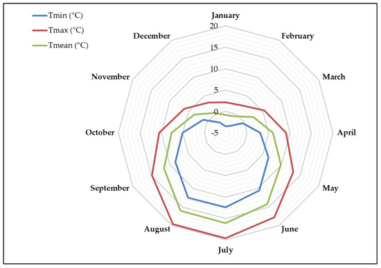 In particular, the monthly minimum, maximum and average temperature data relative to the period 2000–2020 were thus analyzed for estimating the temperature at the investigated test area (Figure 3). The temperature values of the reference station were corrected, applying the equation that takes into account the altitude difference [28]: