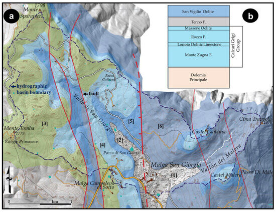 (a) Simplified geological map of the broader investigated area (from [29,30]); [1] moraine materials; [2] proglacial colluvial deposits; [3] Majolica F.; [4] Rosso Ammonitico F.; [5] San Vigilio Oolite F.; [6] Calcari Grigi Group; (b) Simplified stratigraphic succession of the outcropping lithologies [29].