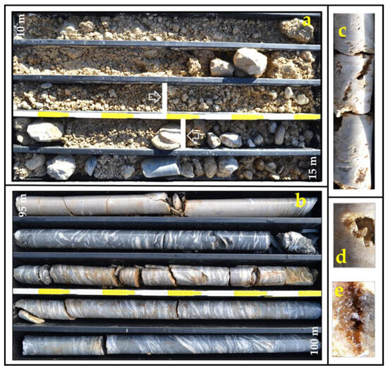 Photo of the cuttings and core. (a) Quaternary deposits from −10 to −15 m showing the position of the Lefranc test (white bars and arrows). (b) Limestones of the Rotzo Formation with a bank of Lithiotis (from −96 to −100 m). (c) Example of micro cavities created by the dissolution of the limestones (−29 m) and details of the spatic calcite infilling (d,e).