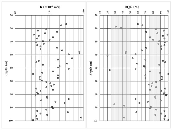 Based on the mean hydraulic conductivity versus the mean RQD correlation, El-Naqa, 2001 [47], and Jiang et al., 2009 [48], suggest that the mean value of the hydraulic conductivity could be estimated using the mean value of the RQD (%) as directly obtained from borehole data. In this research, in order to estimate the hydraulic conductivity, the following empirical equation (based on a determination coefficient of the regression line of R2 = 0.87) was thus applied [47]: