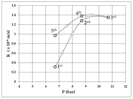 The Lugeon values (q) and the hydraulic conductivity (k) conversion for each step was calculated using the following equations [44,45]: