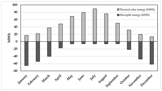 Following the addition of the geotechnical micropiles in the whole project and in line with the principles of the circular economy, the original energy supply project has been deeply modified by exploiting the micropiles as geothermal probes, transforming them into energy micropiles (EmP). Due to the shallow depth of the EmP, the new geothermal solution has thus been implemented together with a solar thermal system. In this way, the thermal energy produced by the solar thermal panels during the summer period is transferred and accumulated in the underground through the same system of EmP, while the stored energy is then extracted for use in space heating during the energetically demanding winter season.