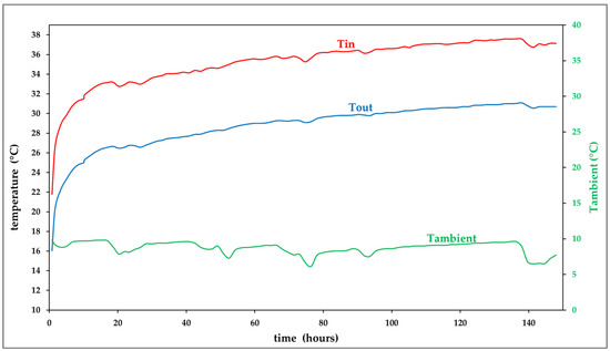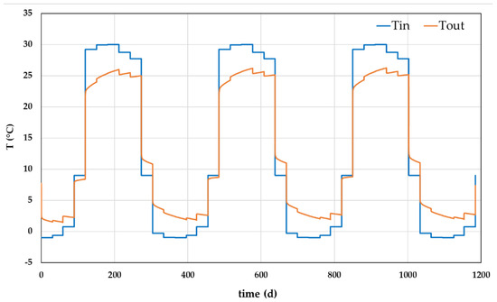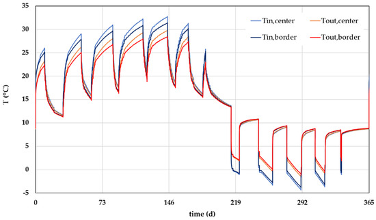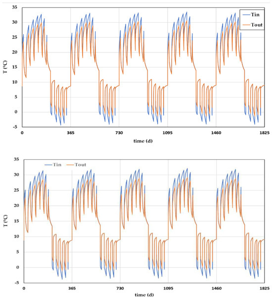 Additional analyses were performed for checking the possibility of avoiding the use of antifreeze fluid. Due to the dry nature of the subsoil, it was not possible to find a proper solution. However, further considerations could be provided. The winter energy could be satisfied at 75% of the demand by imposing a reduced constant flow of 0.011 L/s (0.9504 m3/d) for each EmP, but with a significant increase in operational hours (almost 24 h/24 for the whole winter period). With such conditions, it could be possible to increase the minimum temperature by about 3 K (from −4 °C using 0.02 L/s, to −1 °C using 0.011 L/s). Imposing even lower flows seems unfeasible, since 0.011 L/s is the limit under which the thermal short circuit in the newly designed EmP system becomes prominent. Figure 19 presents the evolution of temperature in such conditions, for the first few years of operation, by imposing the minimum inlet temperature for each month.