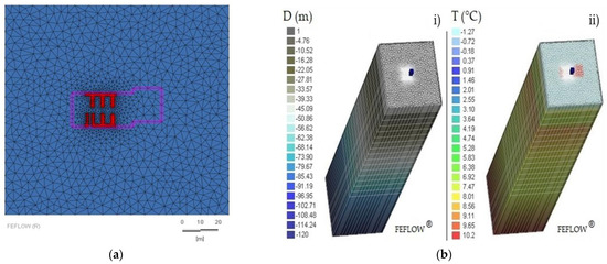 The numerical simulator FEFLOW® (Finite Element Flow Simulator), is a widely used software in the shallow geothermal sector. It is an integrated package including dynamic flow, heat and mass transportation simulation tools. It allows users to create as many layers as necessary and upload database information node by node for each layer. It has specific packages and various dedicated computational methods for single BHEs and BHE fields (linked in many possible configurations), including coaxial types [57,58]. For these reasons, it was considered appropriate for the present research.
