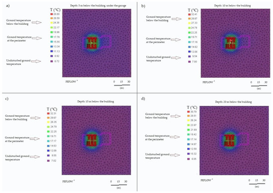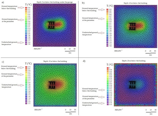 Impact of the work of the geothermal field over the subsoil at the end of the solar heat injection period. Temperatures in the depths of 5 (a), 10 (b), 15 (c) and 20 (d) meters below the building.