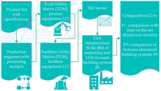 The Ecoinvent building systems per each factory are denoted by ; they are equal to “Steel” for the cell factory and “70% Steel + 30% Timber” for the other three factories . Figure 2 visualizes the inventory integration.
