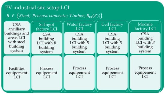 The Ecoinvent LCI database accounts for more than 18,000 datasets [] describing a wide range of processes. Four identified datasets describing the raw data inventories of the infrastructure related to the PV stages under study, production of monocrystalline silicon ingots, silicon wafers, photovoltaic cells and photovoltaic modules, were examined to determine and understand their scope in terms of the building’s life cycle stages as defined in the European standard EN 15978 []. As an overview, in addition to the materiality of the building construction, these datasets also partially include the process equipment for the PV stage, without including any reference to ancillary buildings or areas and their associated facility equipment. These datasets are used to compare the LCIs and LCAs models generated in this work and their main elements are described below.